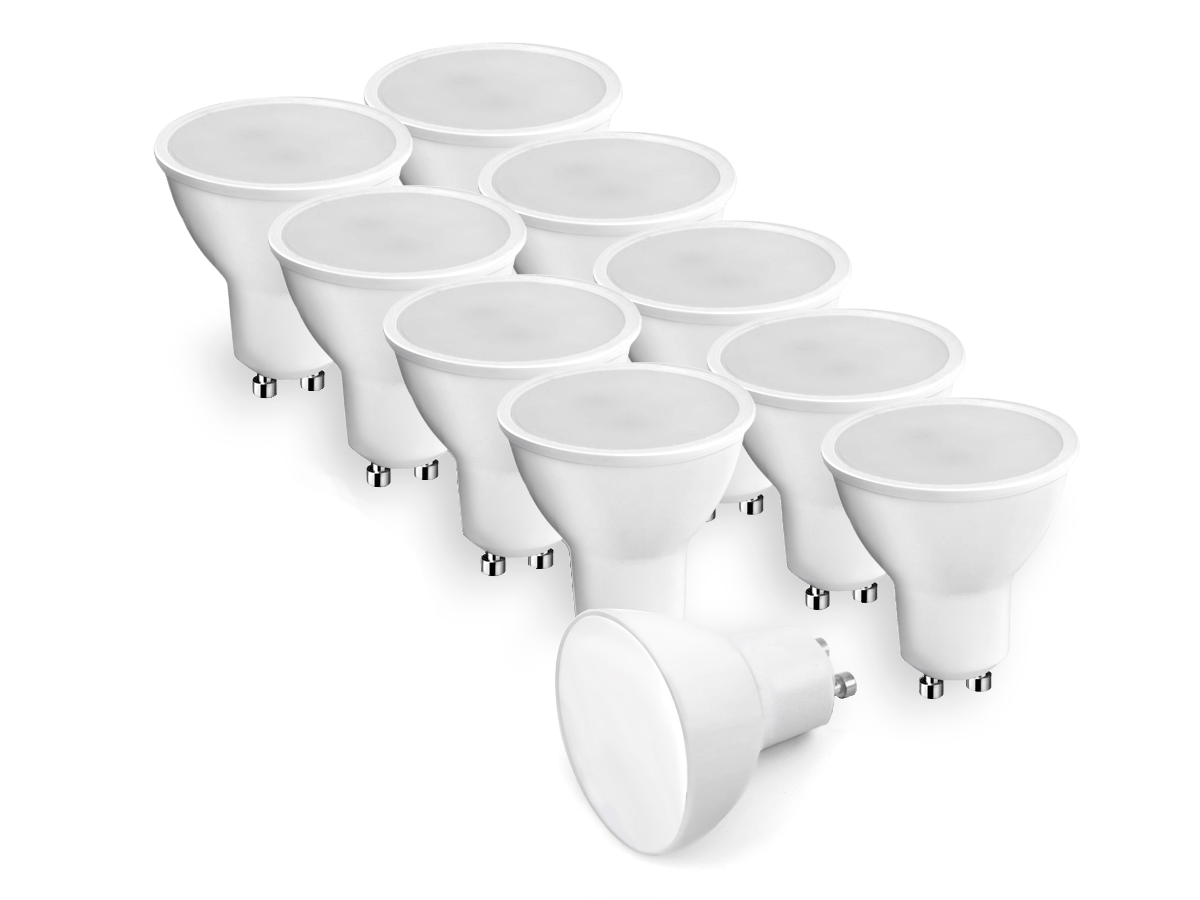 Zestaw 10 energooszczędnych żarówek LED z uniwersalnym gwintem GU10. Produkt posiada niski pobór mocy 8W i efektywność świetlną na poziomie 85 lm/W. Żarówki charakteryzują się ciepłą temperaturą barwową w przedziale 2800-3300K, wysokim współczynnikiem oddawania barw CRI ≥80 oraz optymalnym kątem świecenia 120°. Osiągają do 30 000 h żywotności.