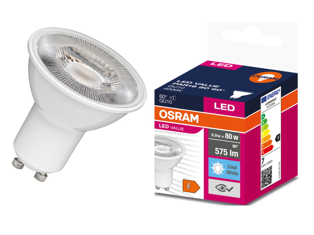 Żarówki, w których źródłem światła jest technologia LED z uniwersalnym gwintem GU10 renomowanej marki Osram. Moc 6,9W jest odpowiednikiem tradycyjnej żarówki o mocy 80W, co przekłada się na wysoką oszczędność pobranej energii elektrycznej. Produkty rozsyłają światło pod kątem 60°, a ich strumień świetlny wynosi 575 lm. Ciepła barwa światła świetnie sprawdzi się w pomieszczeniach zarówno domowych, jak i komercyjnych.